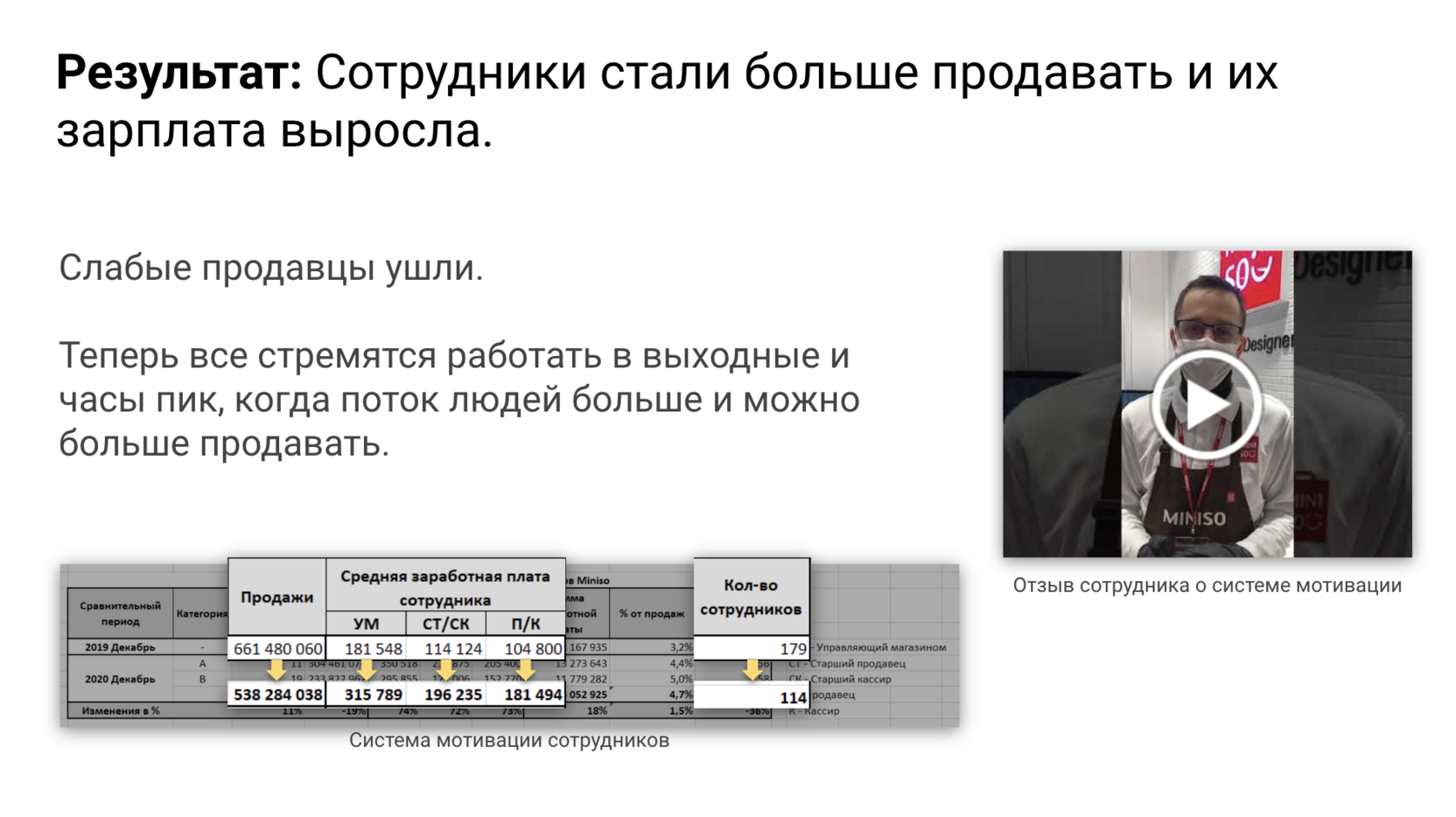 Например, кейс компании MINISO. Сотрудники одного из магазинов получали зарплату за выход на смену и не хотели работать в часы пик и в выходные. Составление графиков не решало вопрос. Поэтому стояла задача привязать зарплату сотрудника к количеству продаж.