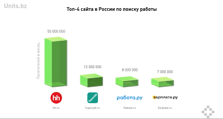 Следующий тип смысловых концентратов — статистика и исследования по теме. Статистика — это достоверный объём отобранных и проанализированных данных, на основе которого можно принимать объективные решения в определённой области. Например, в Юните «Вакансия» приводится статистика посетителей сайтов по поиску работы в России.