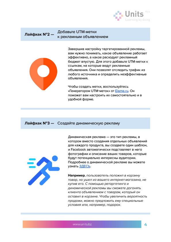 Лайфхаки — это набор неочевидных методик и приёмов для упрощения процесса достижения поставленных целей. Например, файл «Десять лайфхаков по настройке таргетированной рекламы в Facebook и Instagram».