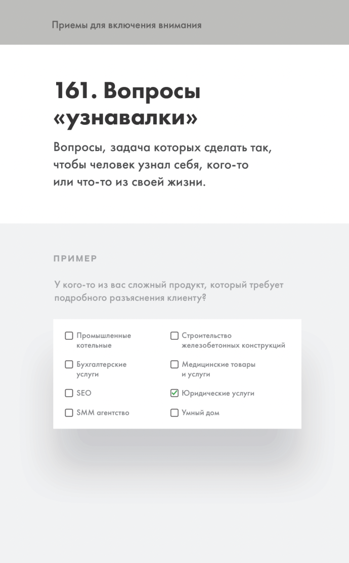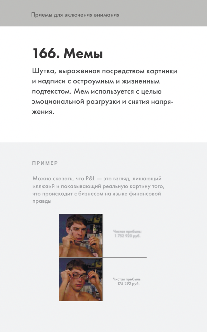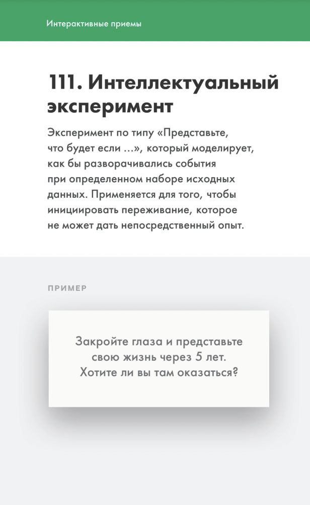 Для макрововлечения мы выделяем 8 факторов: степень когнитивной нагрузки, вера в результат, элементы игры, синтез каналов восприятия, харизма спикера, поддержание коммуникации, вовлекающие формулировки, визуальное вовлечение.